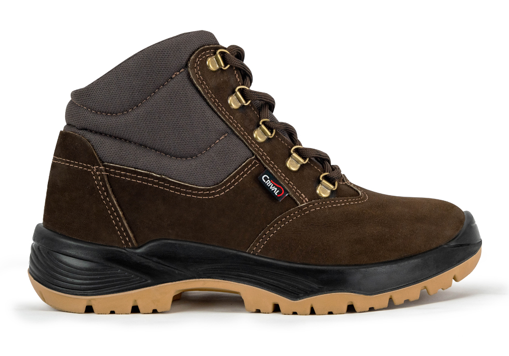 Botina de segurança com fechamento em cadarço recoberto confeccionado em couro nobuck na cor marrom, colarinho com forração interna, forro do cano em nylon com tratamento antimicrobiano.