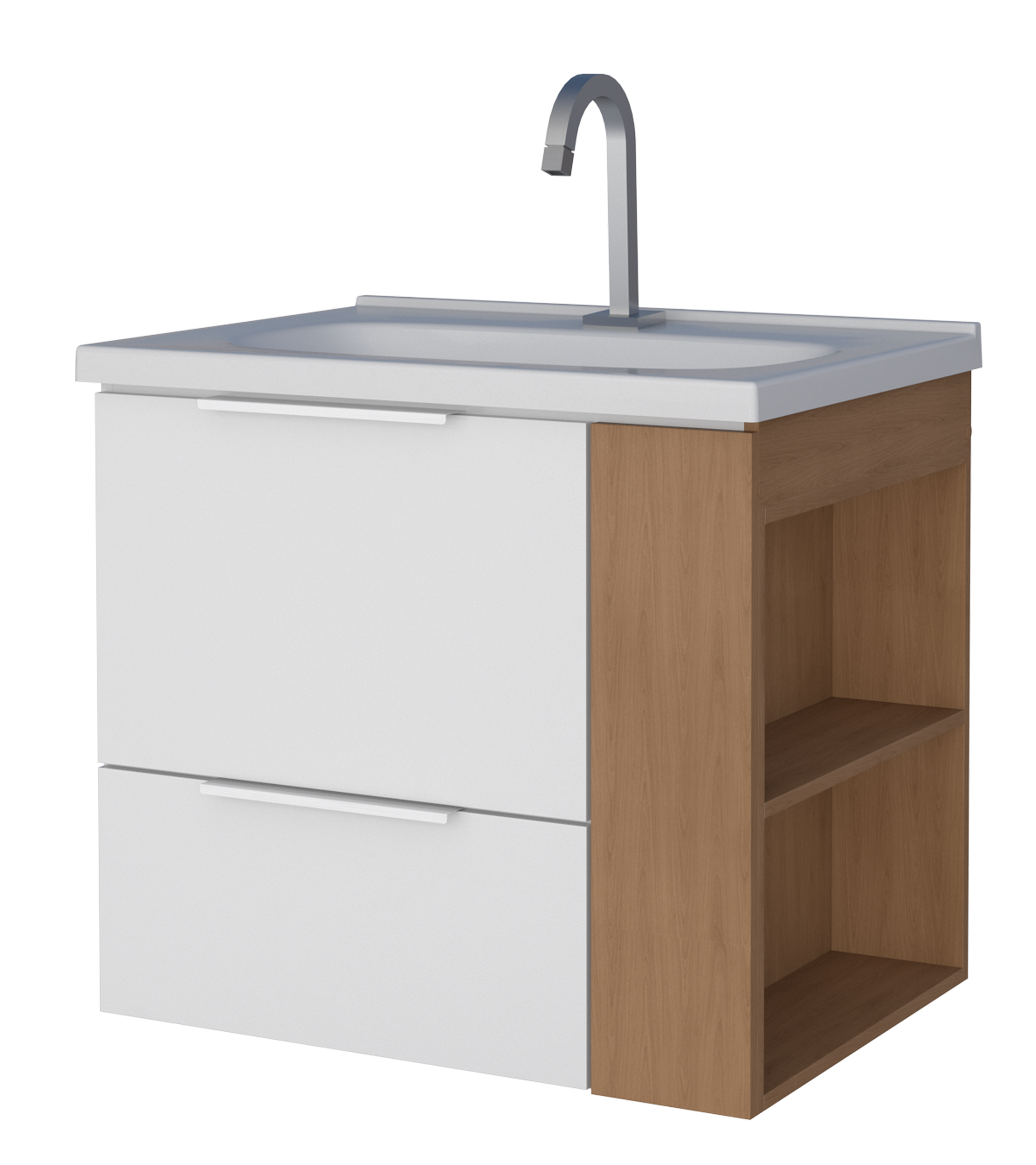 Com um estilo minimalista e design diferenciado e versátil, o banheiro Cosmos se destaca pelo seu nicho lateral em 2 versões: lado direito e lado esquerdo, puxadores em aço, corrediças que deslizam facilmente, porta basculante e um lavatório em mármore sitético com espaço amplo e design exclusivo.