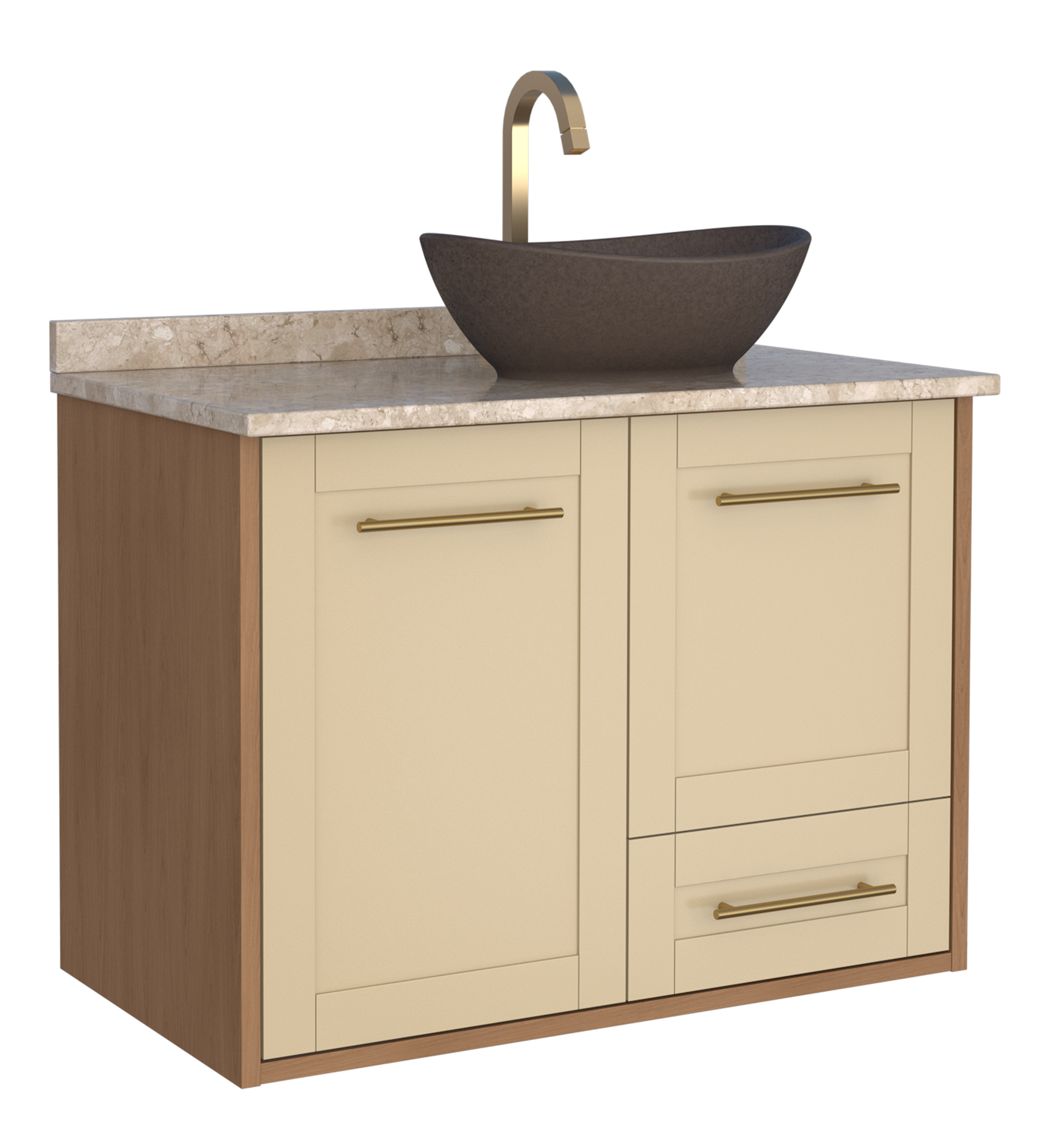 O banheiro em madeira Petúnia da Cozimax une o clássico ao moderno em um estilo provençal único. Ideal para banheiros com amplo espaço, ele conta com tampo em mármore travertino, frente com recobrimento para melhor acabamento e durabilidade, além de puxadores em alumínio, corrediças que deslizam fácil, portas com fechamento suave e prateleira para mais organização.